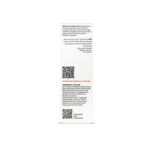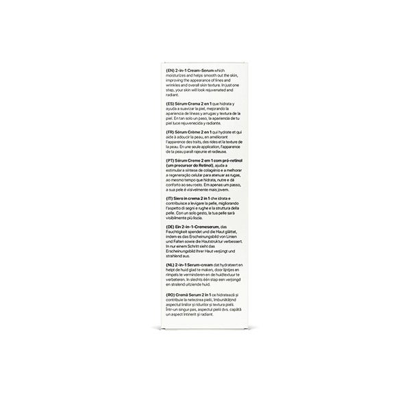 Sérum Creme 2 em 1 com pro-retinol a 0,3% (um precursor do Retinol), ajuda a estimular a síntese de colágeno e a melhorar a regeneração celular para suavizar as rugas, ao mesmo tempo que hidrata, nutre e proporciona conforto ao seu rosto.