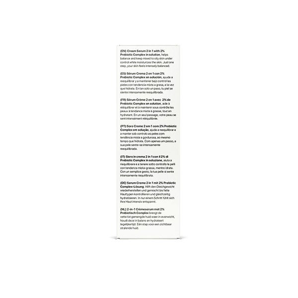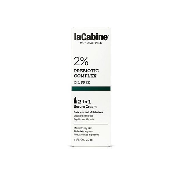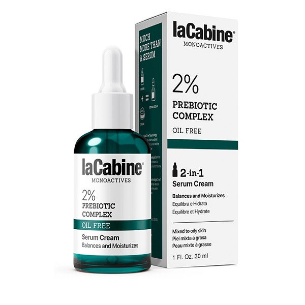 Sérum Creme 2 em 1 laCabine com 2% de Complexo Prebiótico em solução, ajuda a reequilibrar e manter sob controle as peles com tendência mista a oleosa, enquanto hidrata.