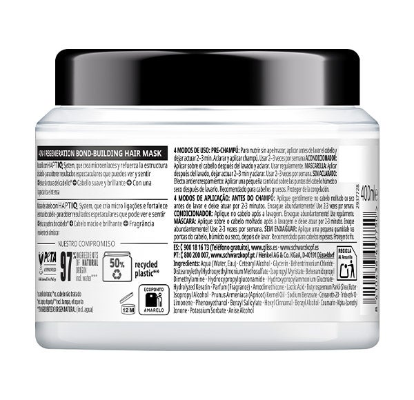 Desenvolvida para cabelos secos e danificados, a Máscara Total Repair 4 em 1 contém uma fórmula com Queratina hidrolisada + HaptIQ System, que protege a estrutura capilar para um cabelo 100% mais forte. Uma máscara regeneradora que reduz a quebra do cabelo, deixando-o suave, liso e brilhante após o uso regular. Para um cabelo sedoso, brilhante e saudável. Repara intensamente o cabelo sem deixá-lo pesado. Para um cabelo sedoso, brilhante e saudável.