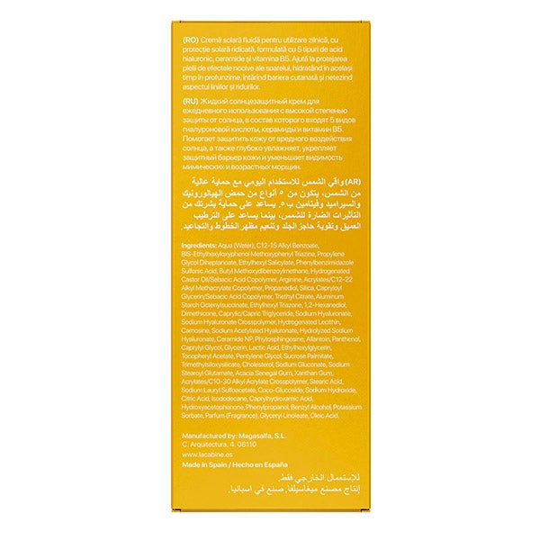 Creme fluida solar de uso diário. Proteção SPF50 formulada com 5 tipos de Ácido Hialurônico, Ceramidas e Vitamina B5. Hidrata e reforça a barreira cutânea.