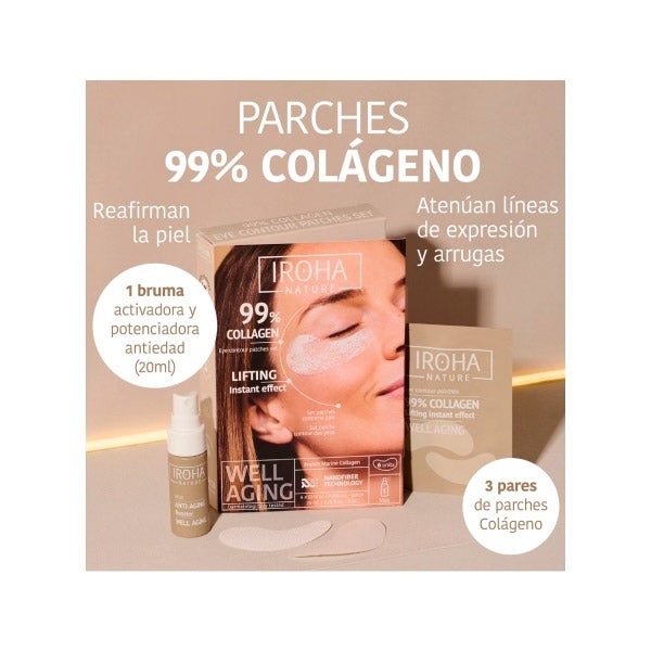 O Patches para o contorno dos olhos 99% Collagen Lifting Effect de Iroha Nature combina a inovadora tecnologia Electrospinning com uma névoa ativadora que dissolve suas nanofibras instantaneamente, liberando o colágeno diretamente nas camadas mais profundas da pele.