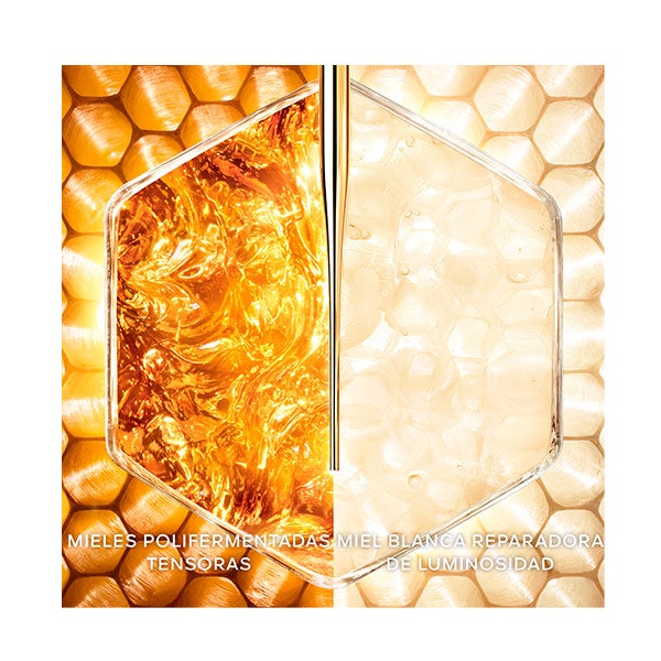 Formulado com 96% de ingredientes derivados da natureza*. Uma mistura de 5 tesouros da abelha: o mel puro da abelha negra da ilha de Ouessant (Bretanha, França), o rico mel da Córsega (França), o lendário mel da ilha de Icaria (Grécia), o raro mel do arquipélago de Aland (Finlândia) e uma exclusiva geleia real francesa.