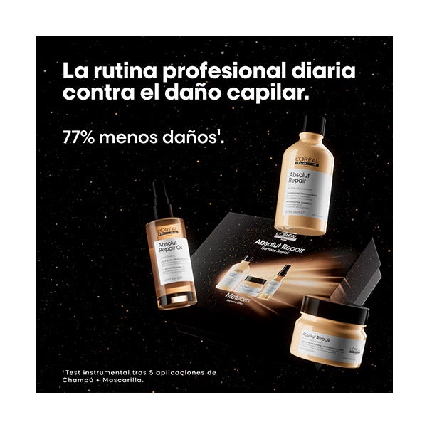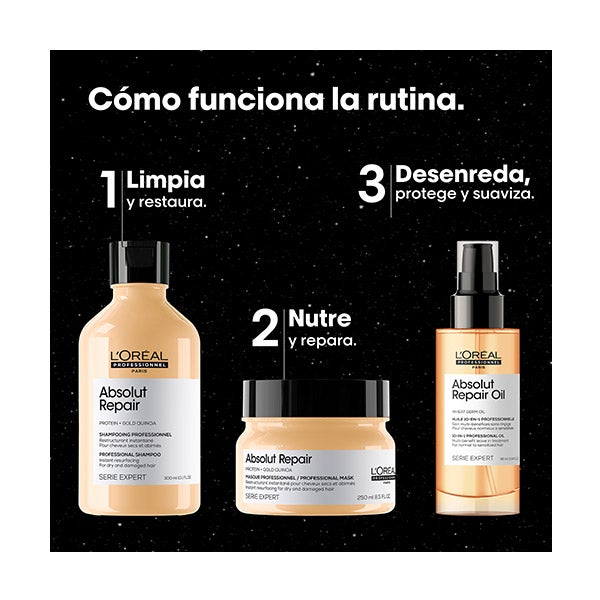O conjunto Absolut Repair (Shampoo + Máscara + Óleo capilar) está enriquecido com proteínas de trigo e Ômega 9, que ajudam na reestruturação intensa da fibra capilar e na sensação de flexibilidade.