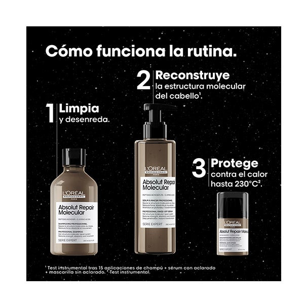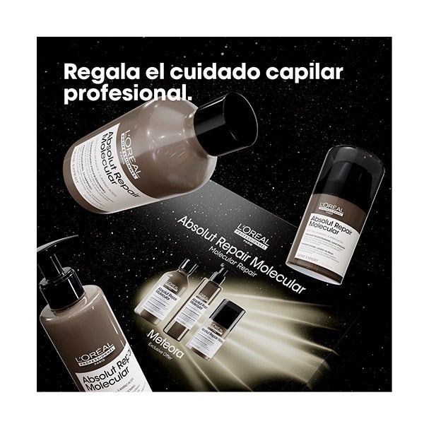 Sérum profissional Absolut Repair Molecular (250ml), para cabelo danificado, formulado com 2% de ligações Peptídicas + 5 Aminoácidos. Esta tecnologia exclusiva repara a estrutura molecular do cabelo. A textura é inspirada na textura dos séruns para cuidados com a pele. Penetra profundamente na fibra capilar para reconstruir a resistência do cabelo a nível capilar. Restaura a elasticidade e o movimento natural do cabelo. O cabelo é visivelmente transformado: o brilho e a suavidade do cabelo são consideravelmente melhorados.