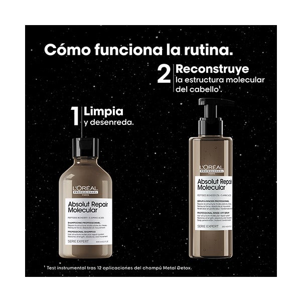 Sérum profissional Absolut Repair Molecular (250ml), para cabelos danificados, formulado com 2% de ligações Peptídicas + 5 Aminoácidos. Esta tecnologia exclusiva repara a estrutura molecular do cabelo. A textura é inspirada na textura dos séruns para cuidados com a pele. Penetra profundamente na fibra capilar para reconstruir a resistência do cabelo a nível capilar. Restaura a elasticidade e o movimento natural do cabelo. O cabelo é visivelmente transformado: o brilho e a suavidade do cabelo são consideravelmente melhorados.