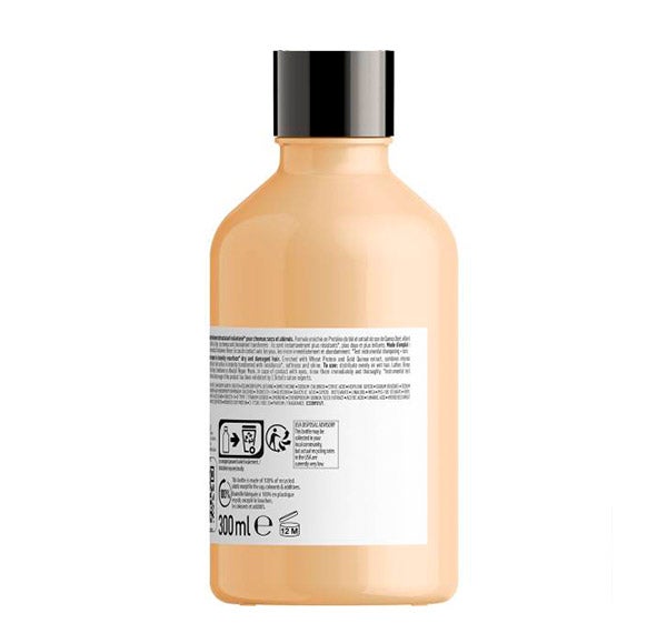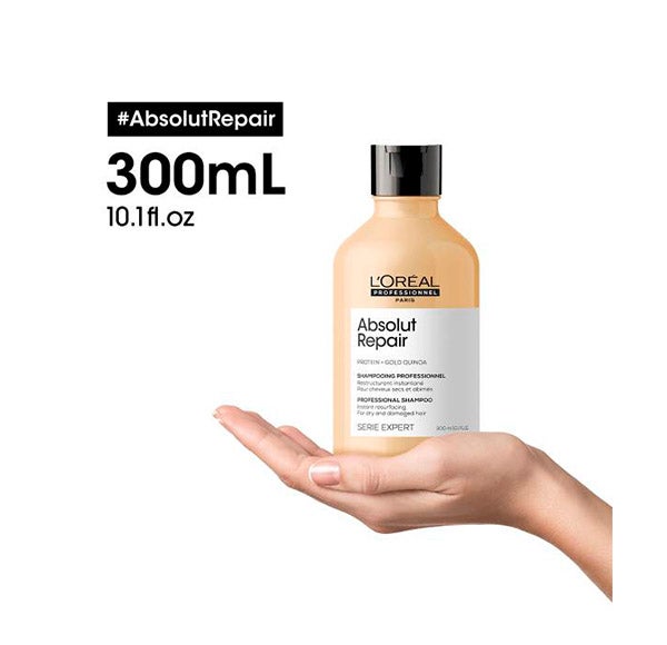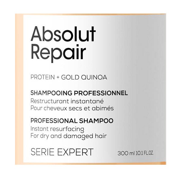 Shampoo Absolut Repair Gold reparador e fortalecedor das áreas mais danificadas do cabelo com proteína de quinoa dourada. Para cabelo muito danificado e enfraquecido. O cabelo fica instantaneamente reconstruído e transformado desde o interior. Limpa, fortalece, repara, reconstrói e protege o cabelo. A parte interna do cabelo é fortalecida. A fibra é reparada e a superfície está protegida de qualquer agressão.