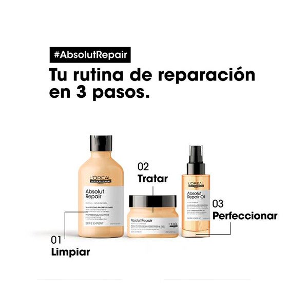 Shampoo Absolut Repair Gold reparador e fortalecedor das áreas mais danificadas do cabelo com proteína de quinoa dourada. Para cabelo muito danificado e enfraquecido. O cabelo fica instantaneamente reconstruído e transformado desde o interior. Limpa, fortalece, repara, reconstrói e protege o cabelo. A parte interna do cabelo é fortalecida. A fibra é reparada e a superfície está protegida de qualquer agressão.