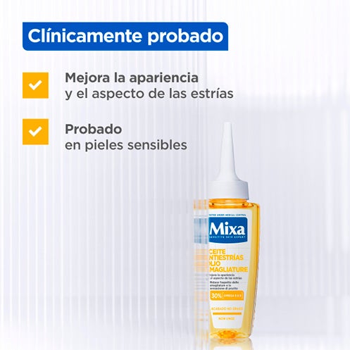 O novo Óleo Antiestrias Mixa, com 30% de Ômega 6 e 9, reduz em 33% a cor das estrias*. Sua fórmula é adequada para o pós-parto, com um acabamento não oleoso. *Autoavaliação em 43 sujeitos após 8 semanas.