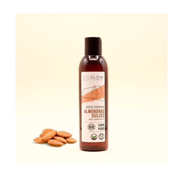 Bioglow Óleo Corporal de Amêndoas Doces hidrata intensamente e regenera a pele seca e irritada. Previne estrias durante a gravidez e é perfeito para peles sensíveis. Deixa a pele suave e nutrida.