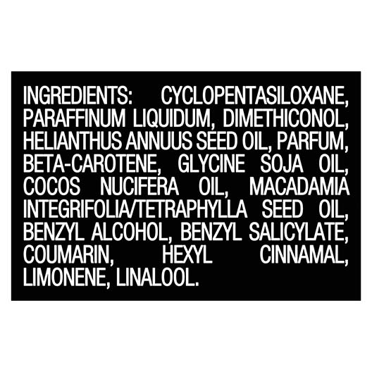 Óleo sem enxágue para um cabelo brilhante. Esfregue de 1 a 3 doses de óleo entre as palmas das suas mãos. Aplique do meio às pontas sobre o cabelo úmido ou seco. Evite contato com os olhos. Em caso de contato, lave com abundante água.
