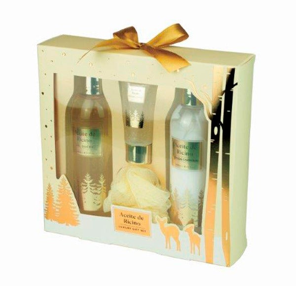 O SET DE BANHO 4 PEÇAS ÓLEO DE RÍCINO consiste em: