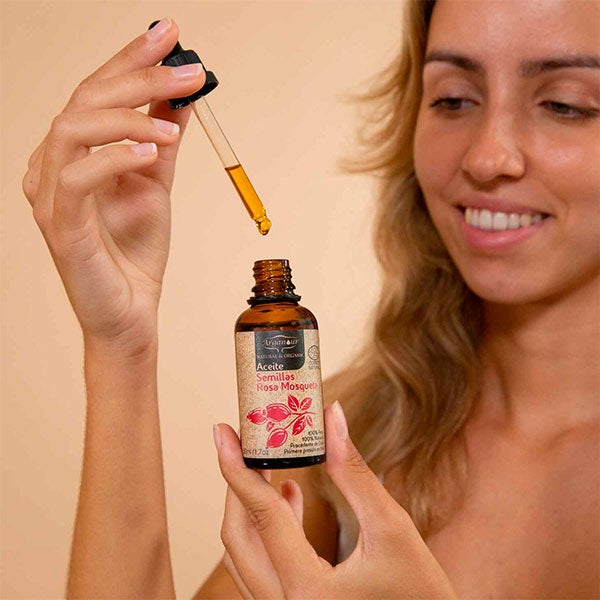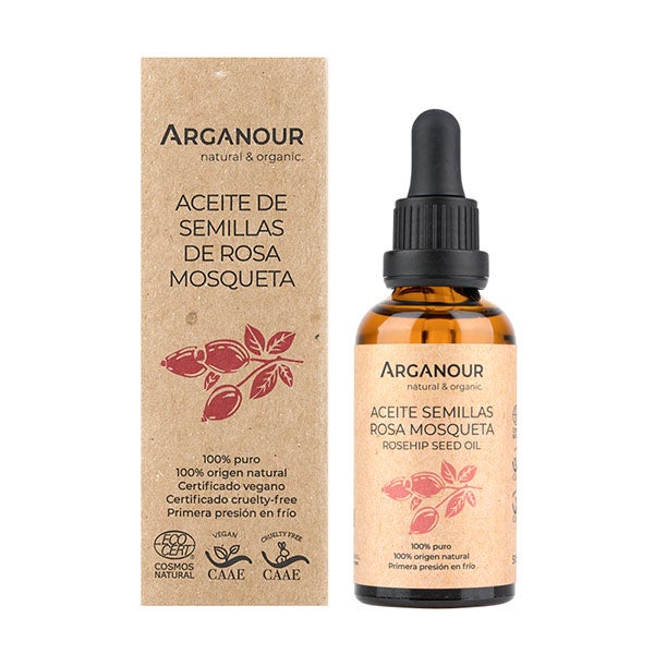 Óleo de sementes de rosa mosqueta 100% puro da Arganour, obtido por primeira prensagem a frio, contém altas concentrações de ácidos graxos essenciais.