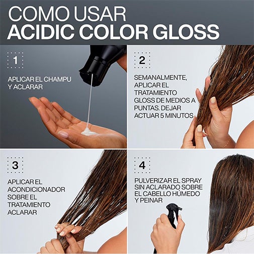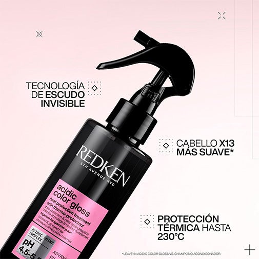Tratamiento spray sin aclarado para cabello coloreado y sin brillo, este tratamiento sin aclarado formulado con Acidic Shine Complex y Tecnología pH Avanzada pH, protege del calor hasta 230ºC, potencia el brillo del cabello gracias a su fórmula con pH ácido que sella la cutícula, fija el brillo y el color, protegendo de los daños causados por las herramientas de calor y la acumulación de residuos en el cabello para un color vibrante más duradero y protección del brillo de salón en casa.