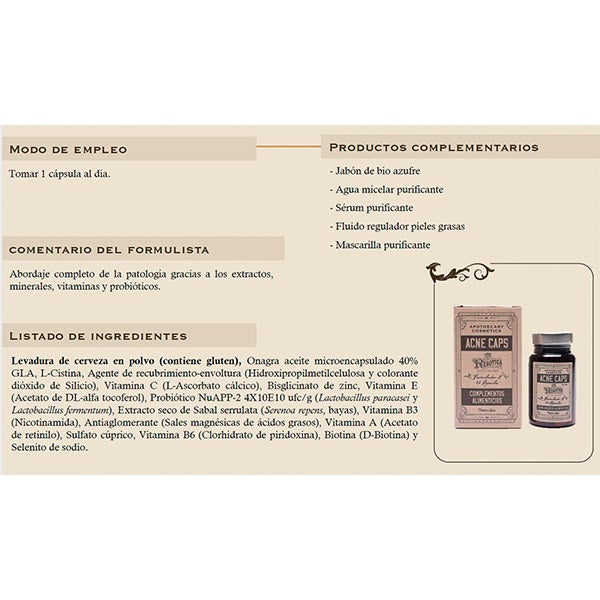 Entre seus componentes, destaca-se a levedura de cerveja, que ajuda a tratar a acne, vitamina A, biotina e zinco que contribuem para manter a pele em condições ótimas.