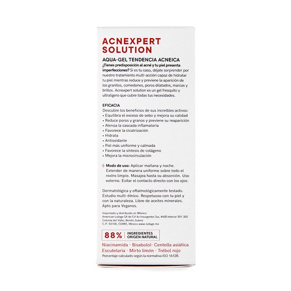 88% ingredientes de origen natural: Niacinamina, Betaína, Mirto Limón, Centella asiática, Trébol rojo, Escutelaría.