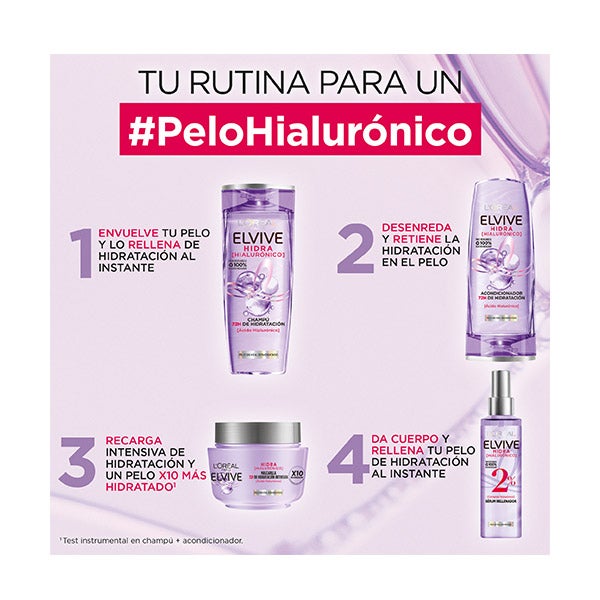 Novo condicionador com ácido hialurônico que desembaraça e retém a hidratação no cabelo durante 72H*. Graças ao Condicionador Hidra Hialurônico exiba um cabelo com uma aparência mais hidratada e cheio de vida, tudo isso sem pesar.