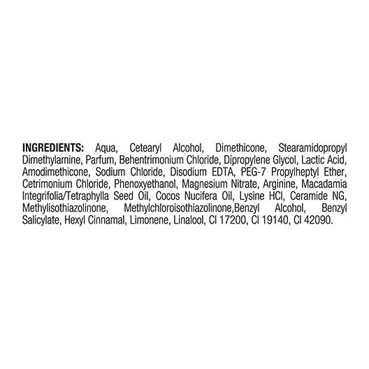 Ingredientes: Aqua, Cetearyl Alcohol, Dimethicone, Stearamidopropyl Dimethylamine, Lactic Acid, Parfum, Behentrimonium Chloride, Dipropylene Glycol, Amodimethicone, Sodium Chloride, Sodium Benzoate, Disodium EDTA, Cetrimonium Chloride, PEG-7 Propylheptyl Ether, Phenoxyethanol, Arginine, Cocos Nucifera Oil, Lysine HCl, Macadamia Integrifolia/Tetraphylla Seed Oil, Ceramide NG, Benzyl Salicylate, Hexyl Cinnamal, Limonene, Linalool, Tetramethyl Acetyloctahydronaphthalenes, CI 17200, CI 19140, CI 42090.