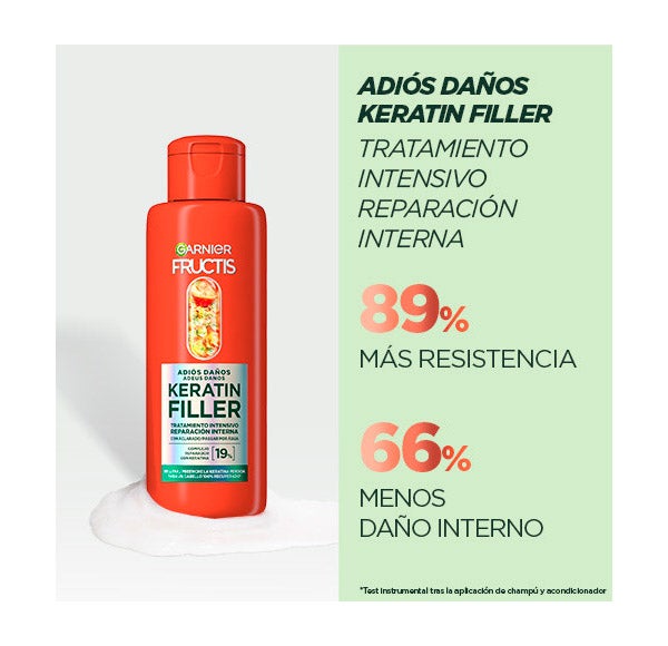 Descubra o segredo da reparação capilar com o Tratamento Intensivo Keratin Filler de Fructis Adeus Danos da Garnier, enriquecido com o poderoso Óleo de Marula. Especialmente desenhado para cabelos danificados, este tratamento oferece uma experiência transformadora que preenche a queratina perdida, reduzindo até 66% o dano interno da fibra capilar.* Experimente uma reparação profunda com nosso tratamento enriquecido com 19% de complexo reparador de queratina. Penetrando até 10 camadas na fibra capilar, restaura internamente até o córtex do cabelo.