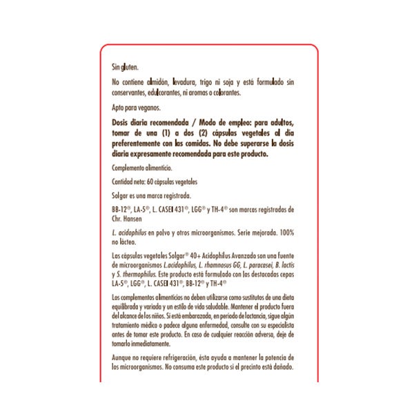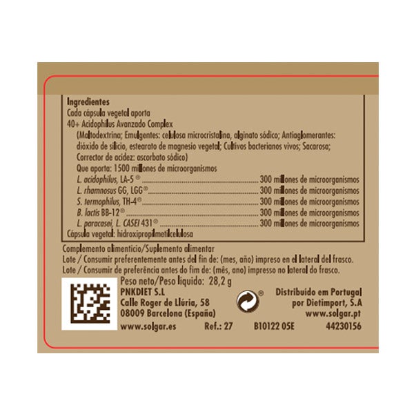 40+Acidophilus Avanzado Complex (Maltodextrina, Emulgentes: celulosa microcristalina, olignato sódico, Antiaglomerantes: dióxido de silicio, estearato de magnesio vegetal, Cultivos bacterianos vivos, Sacarosa, Corrector de acidez, ascorbato sódico).