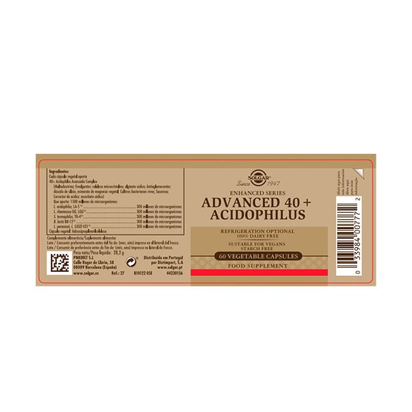 Advanced 40+ Acidophilus é uma formulação não láctea, que fornece as cepas especialmente cultivadas LA-5®, BB-12®, L.CASEI 431®, LGG® e TH-4®.