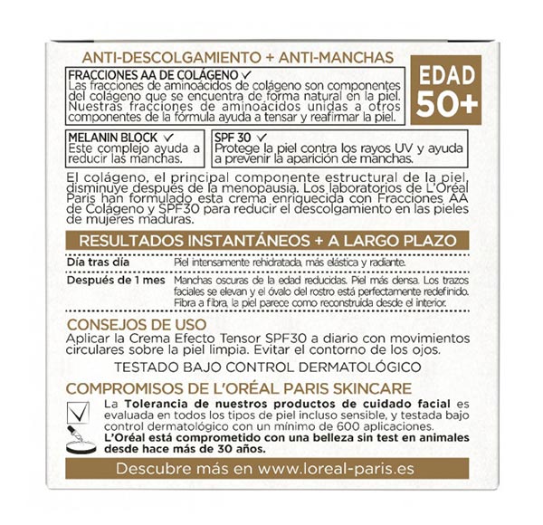Os laboratórios da L’oreal Paris formularam este creme enriquecido com Frações AA de Colágeno e SPF30 para reduzir a flacidez das peles maduras.