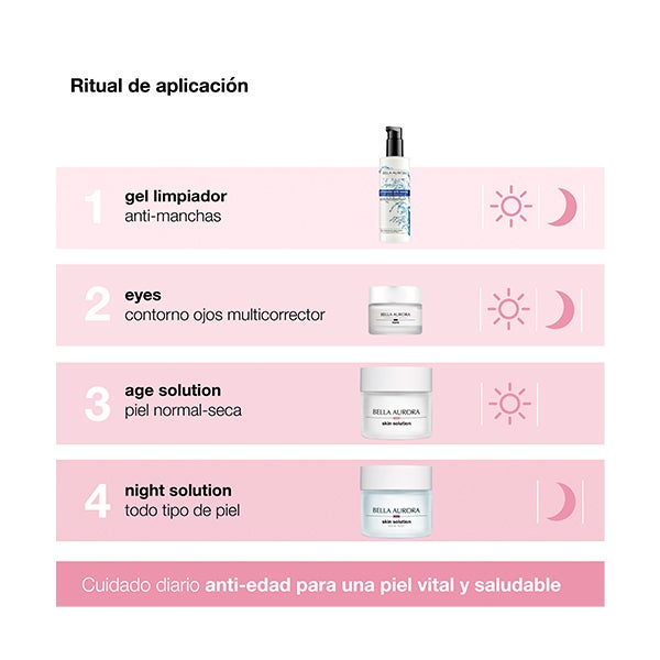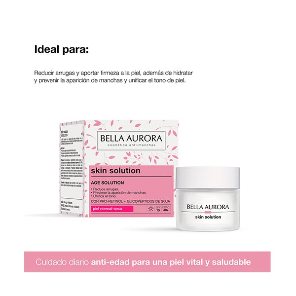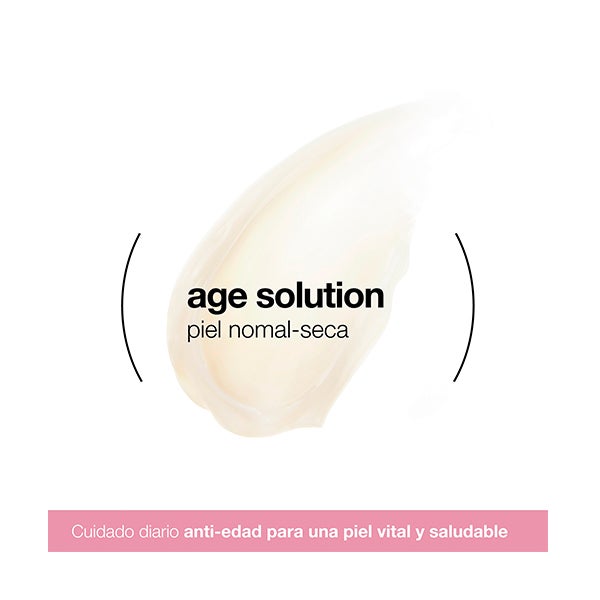 Age Solution é a resposta ao envelhecimento cutâneo graças à combinação de glicopeptídeos de soja altamente purificados e pro-retinol, que se fundem para oferecer uma potente ação anti-rugas e um aumento da firmeza cutânea.