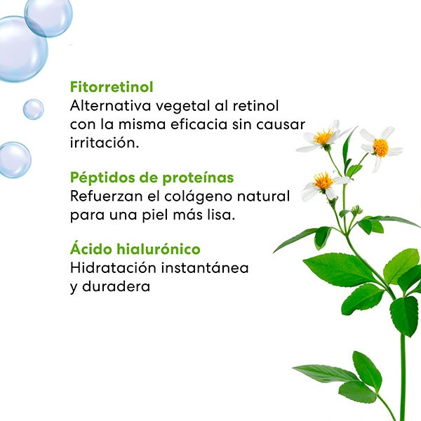Tratamento respeitoso e intensivo à base de fitorretinol para reduzir rugas, os peptídeos de proteína reforçam o colágeno natural da pele e o ácido hialurônico proporciona hidratação.