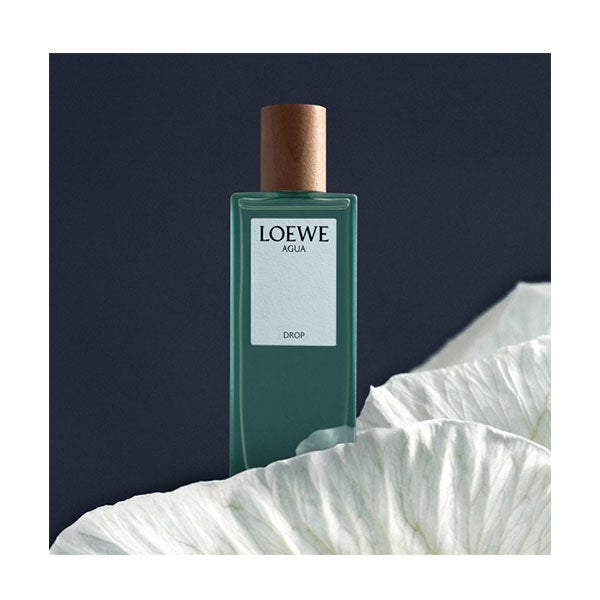 Las fragancias de la familia LOEWE Agua están inspiradas en el brillo y los colores que la luz refleja sobre el agua en movimiento. LOEWE Agua Drop, primer Eau de Parfum de la familia, evoca uno de los momentos más frescos y acuáticos de la naturaleza: las gotas de rocío sobre los pétalos de la jara tras una noche larga y fresca.