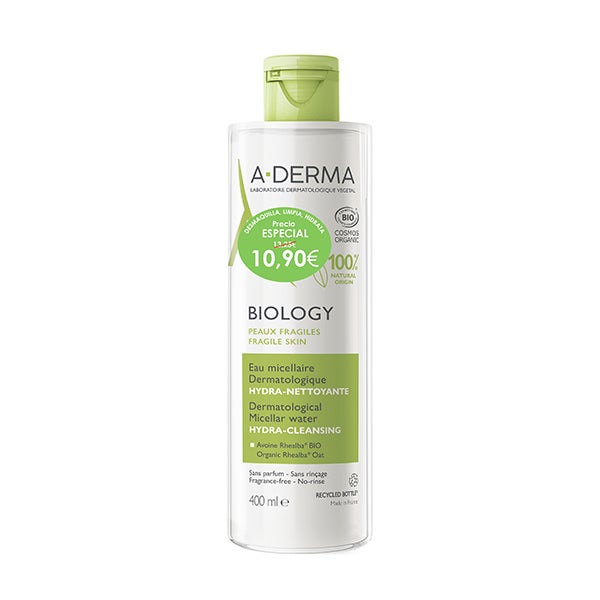Com a ÁGUA MICELAR DERMATOLÓGICA BIOLOGY, A-DERMA desenvolveu o primeiro demaquilante dermatológico e com certificado orgânico adequado para todos os tipos de pele frágil do rosto. Sua fórmula inovadora contém o ingrediente ativo chave da gama BIOLOGY, a Seiva de Aveia Rhealba® Orgânica, conhecida por suas propriedades reequilibrantes e hidratantes, assim como o Extrato de Dente de Leão de propriedades anti-poluição.