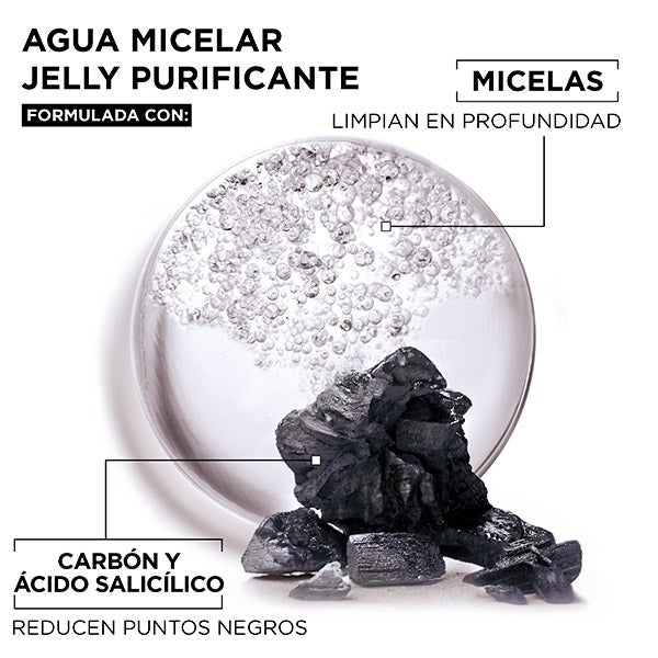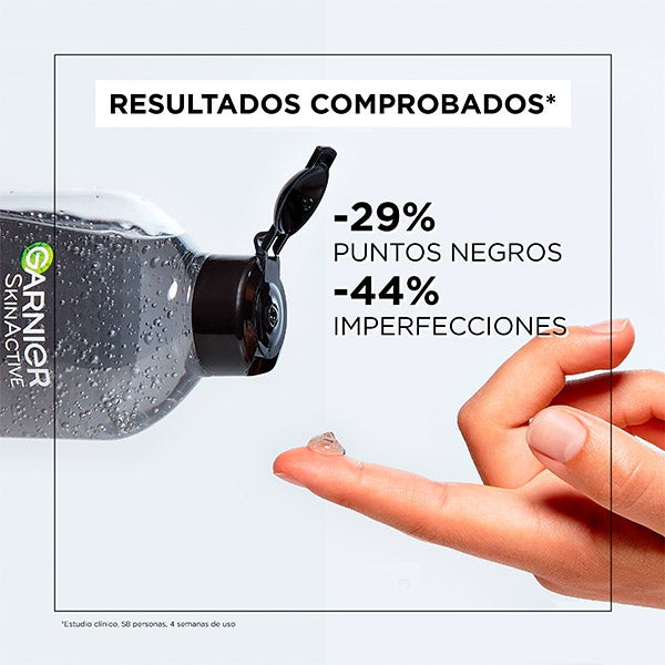 Limpa, desmaquilha e purifica sua pele de uma só vez com a água micelar de carvão e ácido salicílico em gel Garnier Pure Active: Reduz em 44% as imperfeições e em 29% os pontos negros.