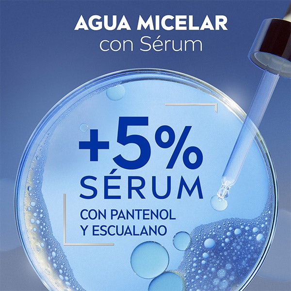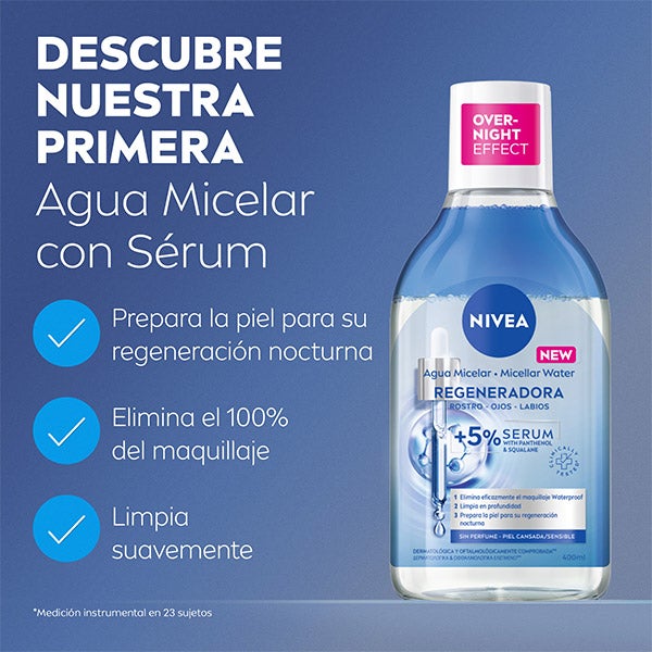 NIVEA Água Micelar Regeneradora para peles cansadas e sensíveis, elimina o maquiagem à prova d'água, as impurezas e a sujidade em poucas passadas, sem deixar resíduos gordurosos. Sua fórmula com 5% de Sérum com Pantenol e Esqualeno + Complexo de Aminoácidos, restabelece a hidratação e regenera a pele. Não é necessário esfregar, por isso limpa a pele com extrema suavidade. Restaura a hidratação e regenera, preparando a pele para sua regeneração noturna e para conseguir uma pele bonita e descansada na manhã seguinte. Seu efeito regenerador está clinicamente comprovado. A fórmula regeneradora não contém perfume e sua compatibilidade com a pele e os olhos está aprovada dermatológica e oftalmologicamente.