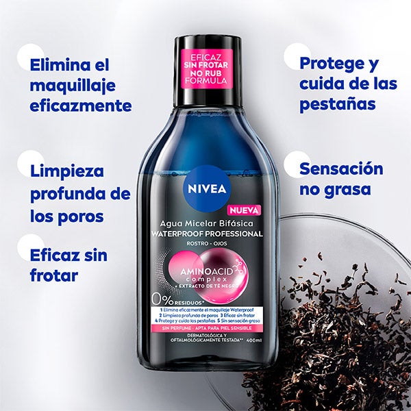 NIVEA Waterproof Professional Água Micelar Bifásica, adequada até para pele sensível, elimina a maquiagem à prova d'água, limpa profundamente os poros e protege e cuida dos cílios deixando 0% de resíduos e sem sensação de pele oleosa. Sua fórmula Waterproof Professional com Amino Acid Complex e Extrato de Chá Preto está enriquecida com Micelas limpadoras e Aminoácidos. Elimina a maquiagem, as impurezas e a sujeira de maneira eficaz, em poucas passadas e sem necessidade de esfregar.