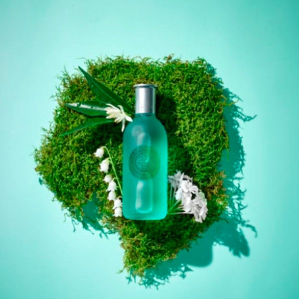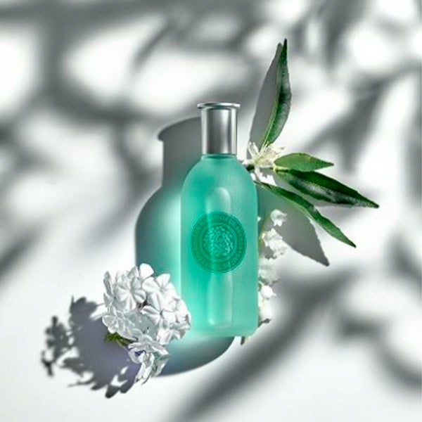 Seu atrativo frasco de vidro irisado imita o frescor da geada e está decorado com ilustrações florais de laranjeiras.