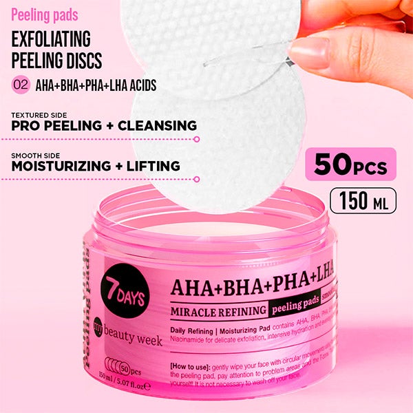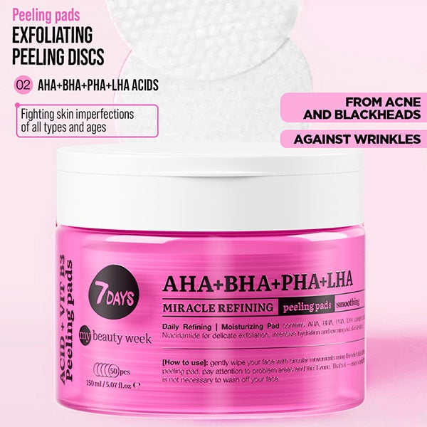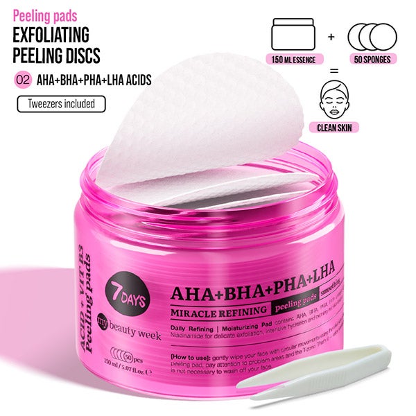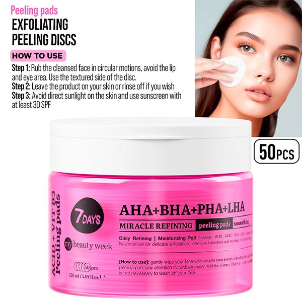 Almofadas esfoliantes faciais refinadoras com complexo PRO de quatro ácidos: 4 passos para alcançar uma pele suave, hidratada, flexível e luminosa.