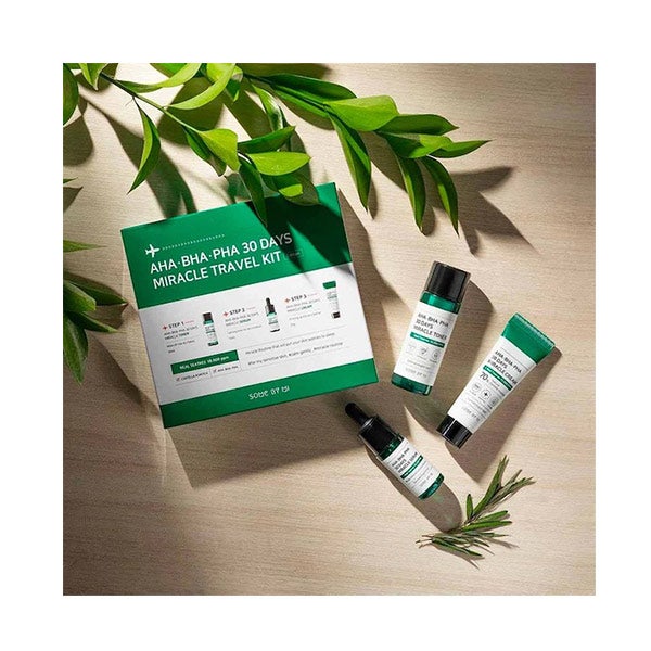 Conjunto de viagem à base de AHA/BHA/PHA, que contém um tônico que esfolia suavemente a pele, um sérum que alivia a irritação e um creme que reforça a barreira cutânea da pele.