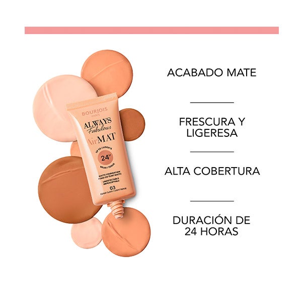 Sinta a frescura da nossa base matificante leve Always Fabulous Air Mat. Mistura-se perfeitamente na pele e fixa-se num acabamento mate duradouro de 24 horas. Graças aos pós micronizados, obterás um acabamento mate perfeito e uma tez impecável que parece completamente natural, permitindo que a pele respire.