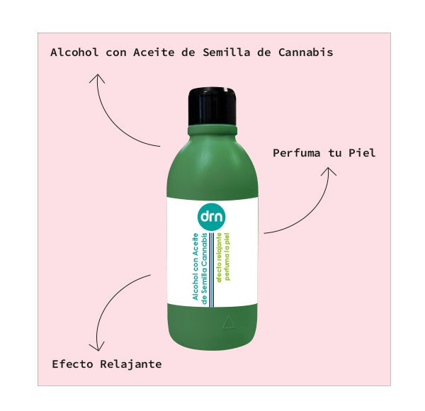 Álcool com óleo de semente de Cannabis ideal para fricções e massagens, pois nutre e perfuma a pele.