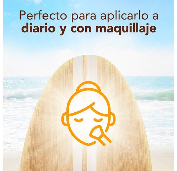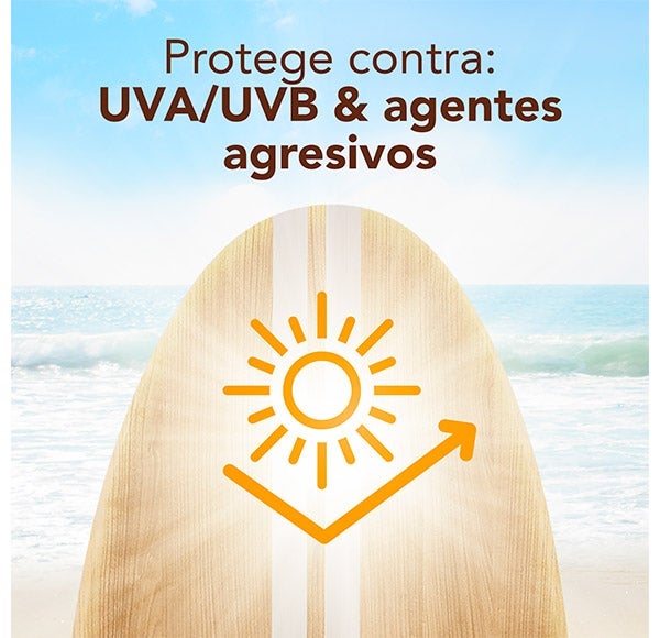 Aplicar de maneira uniforme e abundante por todo o rosto antes da exposição solar.