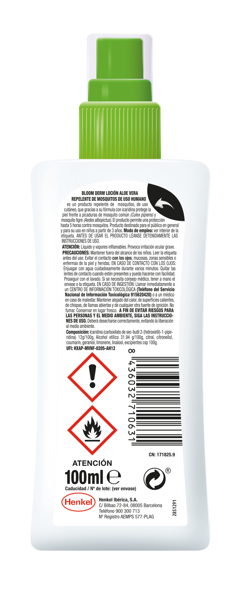 Icaridina (carboxilato de sec-butil 2-(hidroxietil)-1- piperidina) 12g/100g, Alcohol etílico 31.94g/100g, citral, citronellol, coumarin, geraniol, limonene, linalool y excipientes csp 100g.
