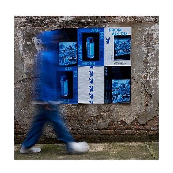 O líquido azul claro está alojado em uma garrafa e um cartão com um código de cor ultramar e azul céu que emana energia vibrante. Projetado para o seu estilo de vida non stop.