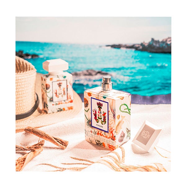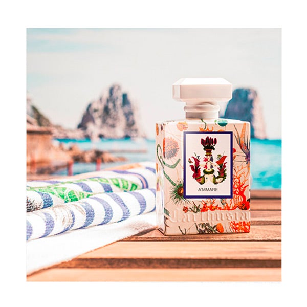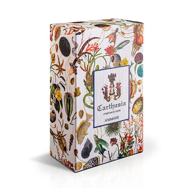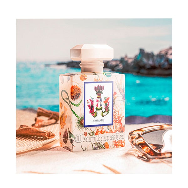 A fragrância A’MMARE da Carthusia representa a vida e a harmonia. Está inspirada em um jardim secreto que se abre entre as ruas da ilha de Capri e se cruza sob o véu das ondas, trazendo ramos de coral e vegetais à margem com conchas e explosões naturais realçadas por um dia ensolarado.