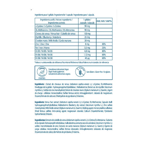 Extracto de cabello de venus (Adiantum capillus-veneris L.); L-Cistina; DL-Metionina; Cubierta de la cápsula: hidroxipropilmetilcelulosa; maltodextrina; extracto seco de arándano (Vaccinium myrtillus L.); sulfato monohidratado de zinc; Extracto de cardo mariano (Silyoum marianum (L.) Gaertn.); Agente de carga: celulosa microcristalina; sulfato ferroso desecado; Anti-aglomerante: estearato de magnesio; D-pantotenato de calcio; clorhidrato de piridoxina; D-biotina.