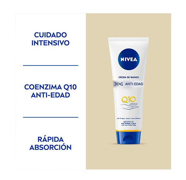 A fórmula anti-rugas de NIVEA Q10 Creme de Mãos Antienvelhecimento 3 em 1, enriquecida com Coenzima Q10 e filtros UV, ajuda a prevenir e reduzir visivelmente os sinais prematuros de envelhecimento e o aparecimento de manchas devidas à radiação solar. Foi testada e comprovada para obter resultados eficazes na pele das mãos. Com uma agradável textura de rápida absorção, além disso, cuida das cutículas com seu uso diário e regular. Estimula a produção de energia da pele melhorando sua capacidade de manter-se suave e firme.