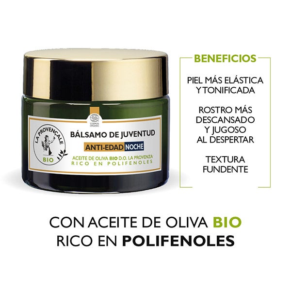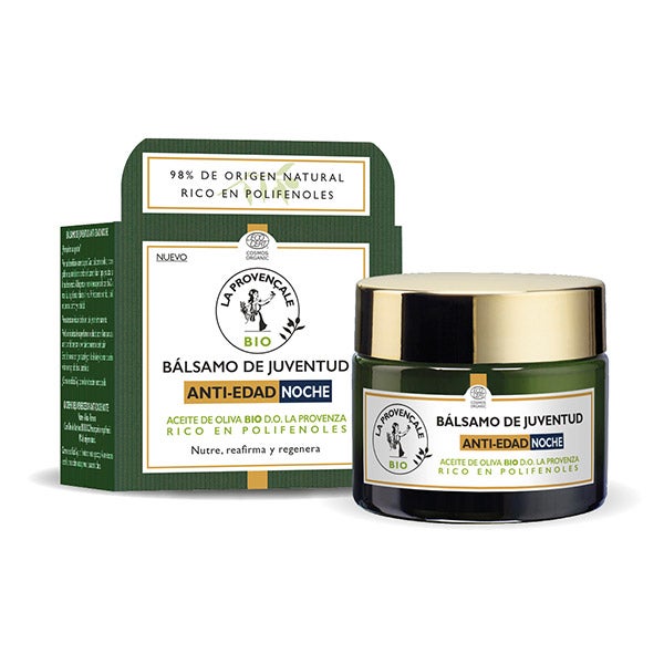 O bálsamo da juventude creme anti-idade noturno com óleo de oliva BIO, rico em polifenóis, atua durante a noite regenerando a pele e combatendo eficazmente as rugas e linhas de expressão. Seu delicado aroma floral envolve a pele para uma sensação de bem-estar e um verdadeiro momento de relaxamento. Ao despertar, o rosto tem aspecto descansado, a pele está nutrida, regenerada e tonificada. Dia após dia, a pele está radiante e firme. Perfeitamente nutrida, a pele recupera seu conforto e elasticidade.