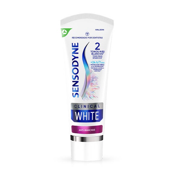 Sensodyne Clinical White Stain proporciona um branqueamento clinicamente comprovado, especialmente desenhado para dentes sensíveis. Sua fórmula de tripla ação clinicamente comprovada contém ingredientes que produzem um branqueamento superior e ajudam a prevenir futuras manchas nos dentes. Apropriada para uso diário, pois não contém peróxido de hidrogênio que poderia provocar um aumento da sensibilidade dental.