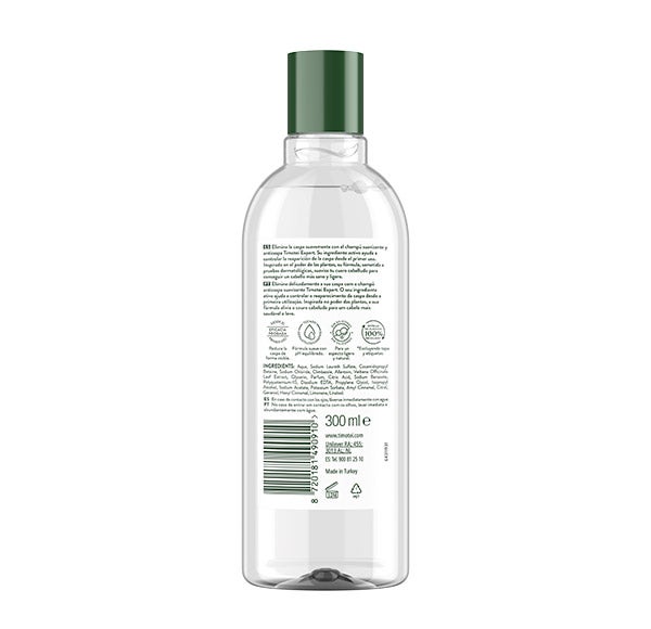 Timotei shampoo anticaspa suavizante com Alantoína, que acalma o couro cabeludo, e com Climbazol, que previne o desenvolvimento da caspa