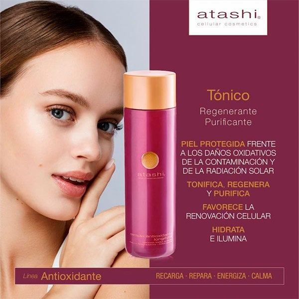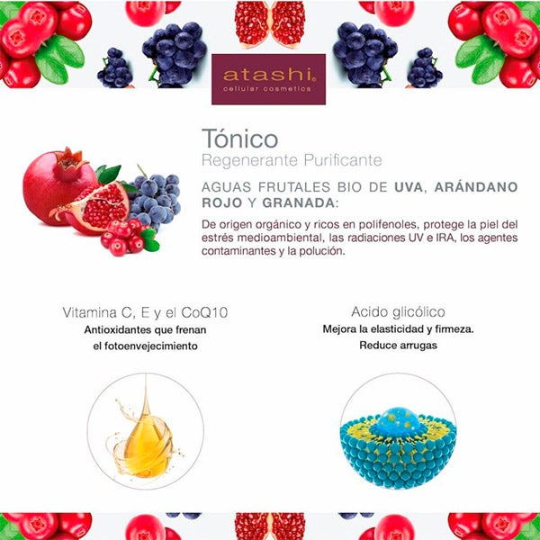 O tônico regenerante purificante foi desenvolvido com águas frutais BIO de Uva, Mirtilo vermelho e Romã que freia o envelhecimento e restaura o dano causado por os efeitos adversos da radiação solar e a poluição.