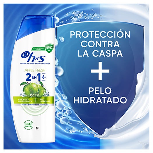O Shampoo e Condicionador Anticaspa H&S Apple Fresh Tudo em Um para todo tipo de cabelo e couro cabeludo é eficaz até contra a caspa mais persistente. Este shampoo de uso diário para homens e mulheres, com fórmula Microbiome Balance, atua sobre a causa principal da caspa e equilibra o microbioma do couro cabeludo. Funciona contra a caspa visível e invisível, liberando o dobro de ingredientes protetores que penetram nos poros para evitar que reapareça a caspa severa e persistente. A fórmula do shampoo Tudo em Um clinicamente testada, dermatologicamente testada e com pH equilibrado contém 25% mais de agentes condicionantes que o shampoo Head & Shoulders.