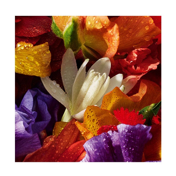 Um generoso ramalhete floral multicolorido exaltado pela força do sândalo e a textura aveludada do musgo.