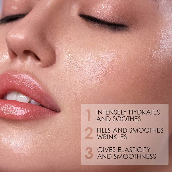 Sua fórmula inteligente funciona como uma máscara hidratante intensiva e um gel hialurônico sem enxágue.
